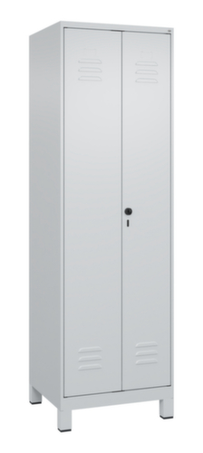 Les principaux détails de la C+P armoire d’entretien Classic Plus en un coup d’œil :La porte à double battant facilite particulièrement l’accès au contenu de l’armoire. Les fentes d’aération assurent une ventilation accrue et protègent ainsi le contenu de l’armoire de l’humidité et de la formation de moisissures, car une bonne circulation de l’air réduit l’humidité. Les gonds intérieurs des portes battantes offrent l’avantage d’un visuel net, car aucune vis ou charnière n’est visible de l’extérieur. Le design de l’armoire n’est donc pas altéré et l’ensemble du meuble semble de meilleure qualité. La surface lisse est également plus facile à nettoyer, car aucun dépôt de saleté ou de poussière n’est à craindre aux endroits inaccessibles. Chaque porte est équipée de série d’un amortisseur, de sorte que, même fermée avec élan, elle ne claque pas. Cela contribue non seulement à améliorer l’environnement sonore, mais protège aussi l’armoire en acier des dommages. 4 niveaux avec tablette. La cloison de séparation médiane raccourcie divise l’armoire en deux parties distinctes qui peuvent être utilisées de différentes manières et pour des objets de différentes tailles, tout en laissant de la place dans la partie inférieure pour les seaux de nettoyage ou autres appareils de nettoyage. Équipé à gauche de 4 casiers avec tablettes fixes, à droite de 1 tringle robuste à profil ovale avec 4 doubles crochets coulissants anti-torsion. verrouillable avec Porte-cadenas de sécurité pour cadenas. La serrure de sécurité est particulièrement résistante aux effractions puisqu’elle tourne en position verrouillée et se verrouille uniquement après le retrait de la serrure. verrouillage commun des portes. Les orifices de ventilation supplémentaires dans le compartiment, combinés aux fentes d’aération dans la porte, améliorent le flux d’air. L’intérieur de l’armoire est ainsi mieux ventilé et son contenu sèche plus vite, sans générer de mauvaises odeurs. Les pieds encastrés en plastique confèrent non seulement un aspect moderne et léger à l’armoire, qui paraît moins massive, mais offrent également des avantages pratiques. L’espace ouvert au-dessus du sol facilite le nettoyage et le matériau plastique offre une protection accrue contre la corrosion. Cet aspect est particulièrement important dans les environnements où les exigences en matière d’hygiène sont élevées. corps avec thermolaquage en RAL7035 gris clair. face avant avec thermolaquage en RAL7035 gris clair.