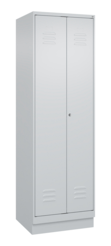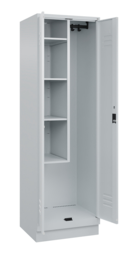 Les principaux détails de la C+P armoire d’entretien Classic Plus en un coup d’œil :La porte à double battant facilite particulièrement l’accès au contenu de l’armoire. Les fentes d’aération assurent une ventilation accrue et protègent ainsi le contenu de l’armoire de l’humidité et de la formation de moisissures, car une bonne circulation de l’air réduit l’humidité. Les gonds intérieurs des portes battantes offrent l’avantage d’un visuel net, car aucune vis ou charnière n’est visible de l’extérieur. Le design de l’armoire n’est donc pas altéré et l’ensemble du meuble semble de meilleure qualité. La surface lisse est également plus facile à nettoyer, car aucun dépôt de saleté ou de poussière n’est à craindre aux endroits inaccessibles. Chaque porte est équipée de série d’un amortisseur, de sorte que, même fermée avec élan, elle ne claque pas. Cela contribue non seulement à améliorer l’environnement sonore, mais protège aussi l’armoire en acier des dommages. 4 niveaux avec tablette. La cloison de séparation médiane raccourcie divise l’armoire en deux parties distinctes qui peuvent être utilisées de différentes manières et pour des objets de différentes tailles, tout en laissant de la place dans la partie inférieure pour les seaux de nettoyage ou autres appareils de nettoyage. Équipé à gauche de 4 casiers avec tablettes fixes, à droite de 1 tringle robuste à profil ovale avec 4 doubles crochets coulissants anti-torsion. verrouillable avec serrure à cylindre. verrouillage commun des portes. Les orifices de ventilation supplémentaires dans le compartiment, combinés aux fentes d’aération dans la porte, améliorent le flux d’air. L’intérieur de l’armoire est ainsi mieux ventilé et son contenu sèche plus vite, sans générer de mauvaises odeurs. Le socle encastré permet de répartir uniformément le poids de l’armoire sur le sol. Cela augmente la stabilité et l’armoire peut supporter des charges plus lourdes qu’une armoire à pieds. De plus, la saleté, la poussière et l’humidité ne peuvent pas s’infiltrer sous l’armoire, ce qui réduit la surface de nettoyage. corps avec thermolaquage en RAL7035 gris clair. face avant avec thermolaquage en RAL7035 gris clair.