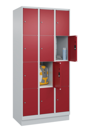Les principales dimensions de C+P l’armoire multicases Classic Plus en un coup d’œil :corps avec porte battante simple. Les gonds intérieurs des portes battantes offrent l’avantage d’un visuel net, car aucune vis ou charnière n’est visible de l’extérieur. Le design de l’armoire n’est donc pas altéré et l’ensemble du meuble semble de meilleure qualité. La surface lisse est également plus facile à nettoyer, car aucun dépôt de saleté ou de poussière n’est à craindre aux endroits inaccessibles. Chaque porte est équipée de série d’un amortisseur, de sorte que, même fermée avec élan, elle ne claque pas. Cela contribue non seulement à améliorer l’environnement sonore, mais protège aussi l’armoire en acier des dommages. La structure BIONIC Steel Frame, inspirée de la nature, est une construction particulièrement efficace et stable. La structure interne raffinée composée de pliages, d’entretoises et d’espaces, ainsi que la plus grande épaisseur de matériau aux endroits cruciaux, comme à l’avant des parois latérales et dans les profilés de cloisons et de caissons, augmentent encore la rigidité. verrouillable avec serrure à cylindre. Le socle encastré permet de répartir uniformément le poids de l’armoire sur le sol. Cela augmente la stabilité et l’armoire peut supporter des charges plus lourdes qu’une armoire à pieds. De plus, la saleté, la poussière et l’humidité ne peuvent pas s’infiltrer sous l’armoire, ce qui réduit la surface de nettoyage. structure en acier, soudé de manière stable. Cela rend la structure particulièrement robuste et résistante, et donc plus durable. Les coins et les angles soudés du corps garantissent une plus grande étanchéité et donc une meilleure protection contre la poussière, l’humidité et la saleté qu’une structure vissée. En outre, il n’est pas nécessaire de procéder à des travaux d’entretien réguliers ni à des réajustements. corps avec thermolaquage en RAL7035 gris clair. face avant avec thermolaquage en RAL3003 rouge rubis.