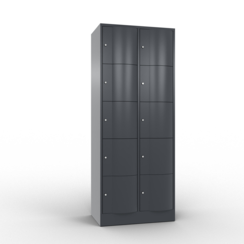 La porte battante convexe vers l’avant est absolument stable et résistante au vandalisme, même aux coups de pied. Les portes battantes sont montées sur des charnières robustes à espagnolettes internes et résistent ainsi à des sollicitations élevées. Chaque porte est équipée de série d’un amortisseur, de sorte que, même fermée avec élan, elle ne claque pas. Cela contribue non seulement à améliorer l’environnement sonore, mais protège aussi l’armoire en acier des dommages. De plus, la limitation d’ouverture de porte protège la porte contre l’extension excessive et contre le chevauchement de la surface utile avec l’armoire annexe. verrouillable avec serrure à cylindre. Les orifices de ventilation dans la paroi arrière assurent une bonne circulation de l’air dans chaque casier. Grâce au plateau supérieur, l’armoire à poser peut être utilisée comme surface de travail ou tablette supplémentaire. Le socle encastré permet de répartir uniformément le poids de l’armoire sur le sol. Cela augmente la stabilité et l’armoire peut supporter des charges plus lourdes qu’une armoire à pieds. De plus, la saleté, la poussière et l’humidité ne peuvent pas s’infiltrer sous l’armoire, ce qui réduit la surface de nettoyage. structure en tôle d'acier, soudé. corps avec thermolaquage. face avant avec thermolaquage.