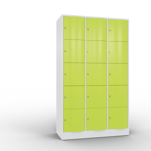 La porte battante convexe vers l’avant est absolument stable et résistante au vandalisme, même aux coups de pied. Les portes battantes sont montées sur des charnières robustes à espagnolettes internes et résistent ainsi à des sollicitations élevées. Chaque porte est équipée de série d’un amortisseur, de sorte que, même fermée avec élan, elle ne claque pas. Cela contribue non seulement à améliorer l’environnement sonore, mais protège aussi l’armoire en acier des dommages. De plus, la limitation d’ouverture de porte protège la porte contre l’extension excessive et contre le chevauchement de la surface utile avec l’armoire annexe. verrouillable avec serrure à cylindre. Les orifices de ventilation dans la paroi arrière assurent une bonne circulation de l’air dans chaque casier. Grâce au plateau supérieur, l’armoire à poser peut être utilisée comme surface de travail ou tablette supplémentaire. Le socle encastré permet de répartir uniformément le poids de l’armoire sur le sol. Cela augmente la stabilité et l’armoire peut supporter des charges plus lourdes qu’une armoire à pieds. De plus, la saleté, la poussière et l’humidité ne peuvent pas s’infiltrer sous l’armoire, ce qui réduit la surface de nettoyage. structure en tôle d'acier, soudé. corps avec thermolaquage. face avant avec thermolaquage.
