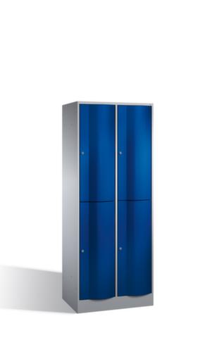 La porte battante convexe vers l’avant est absolument stable et résistante au vandalisme, même aux coups de pied. Les portes battantes sont montées sur des charnières robustes à espagnolettes internes et résistent ainsi à des sollicitations élevées. Chaque porte est équipée de série d’un amortisseur, de sorte que, même fermée avec élan, elle ne claque pas. Cela contribue non seulement à améliorer l’environnement sonore, mais protège aussi l’armoire en acier des dommages. De plus, la limitation d’ouverture de porte protège la porte contre l’extension excessive et contre le chevauchement de la surface utile avec l’armoire annexe. verrouillable avec serrure à cylindre. Les orifices de ventilation dans la paroi arrière assurent une bonne circulation de l’air dans chaque casier. Grâce au plateau supérieur, l’armoire à poser peut être utilisée comme surface de travail ou tablette supplémentaire. Le socle encastré permet de répartir uniformément le poids de l’armoire sur le sol. Cela augmente la stabilité et l’armoire peut supporter des charges plus lourdes qu’une armoire à pieds. De plus, la saleté, la poussière et l’humidité ne peuvent pas s’infiltrer sous l’armoire, ce qui réduit la surface de nettoyage. structure en tôle d'acier, soudé. corps avec thermolaquage. face avant avec thermolaquage.
