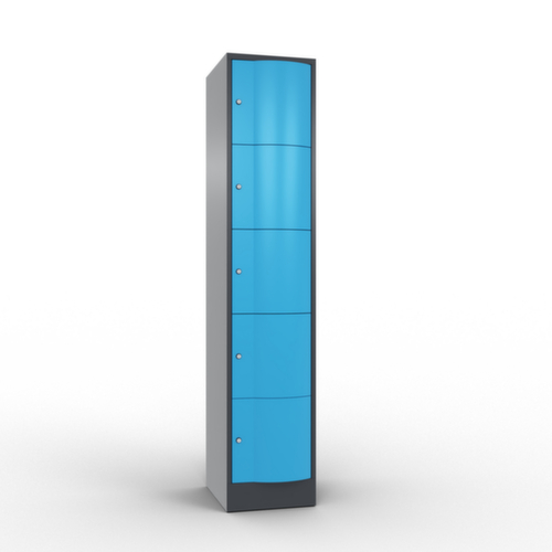 La porte battante convexe vers l’avant est absolument stable et résistante au vandalisme, même aux coups de pied. Les portes battantes sont montées sur des charnières robustes à espagnolettes internes et résistent ainsi à des sollicitations élevées. Chaque porte est équipée de série d’un amortisseur, de sorte que, même fermée avec élan, elle ne claque pas. Cela contribue non seulement à améliorer l’environnement sonore, mais protège aussi l’armoire en acier des dommages. De plus, la limitation d’ouverture de porte protège la porte contre l’extension excessive et contre le chevauchement de la surface utile avec l’armoire annexe. verrouillable avec serrure à cylindre. Les orifices de ventilation dans la paroi arrière assurent une bonne circulation de l’air dans chaque casier. Grâce au plateau supérieur, l’armoire à poser peut être utilisée comme surface de travail ou tablette supplémentaire. Le socle encastré permet de répartir uniformément le poids de l’armoire sur le sol. Cela augmente la stabilité et l’armoire peut supporter des charges plus lourdes qu’une armoire à pieds. De plus, la saleté, la poussière et l’humidité ne peuvent pas s’infiltrer sous l’armoire, ce qui réduit la surface de nettoyage. structure en tôle d'acier, soudé. corps avec thermolaquage. face avant avec thermolaquage.