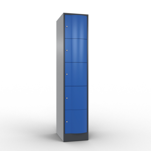 La porte battante convexe vers l’avant est absolument stable et résistante au vandalisme, même aux coups de pied. Les portes battantes sont montées sur des charnières robustes à espagnolettes internes et résistent ainsi à des sollicitations élevées. Chaque porte est équipée de série d’un amortisseur, de sorte que, même fermée avec élan, elle ne claque pas. Cela contribue non seulement à améliorer l’environnement sonore, mais protège aussi l’armoire en acier des dommages. De plus, la limitation d’ouverture de porte protège la porte contre l’extension excessive et contre le chevauchement de la surface utile avec l’armoire annexe. verrouillable avec serrure à cylindre. Les orifices de ventilation dans la paroi arrière assurent une bonne circulation de l’air dans chaque casier. Grâce au plateau supérieur, l’armoire à poser peut être utilisée comme surface de travail ou tablette supplémentaire. Le socle encastré permet de répartir uniformément le poids de l’armoire sur le sol. Cela augmente la stabilité et l’armoire peut supporter des charges plus lourdes qu’une armoire à pieds. De plus, la saleté, la poussière et l’humidité ne peuvent pas s’infiltrer sous l’armoire, ce qui réduit la surface de nettoyage. structure en tôle d'acier, soudé. corps avec thermolaquage. face avant avec thermolaquage.