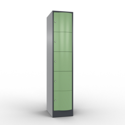 La porte battante convexe vers l’avant est absolument stable et résistante au vandalisme, même aux coups de pied. Les portes battantes sont montées sur des charnières robustes à espagnolettes internes et résistent ainsi à des sollicitations élevées. Chaque porte est équipée de série d’un amortisseur, de sorte que, même fermée avec élan, elle ne claque pas. Cela contribue non seulement à améliorer l’environnement sonore, mais protège aussi l’armoire en acier des dommages. De plus, la limitation d’ouverture de porte protège la porte contre l’extension excessive et contre le chevauchement de la surface utile avec l’armoire annexe. verrouillable avec serrure à cylindre. Les orifices de ventilation dans la paroi arrière assurent une bonne circulation de l’air dans chaque casier. Grâce au plateau supérieur, l’armoire à poser peut être utilisée comme surface de travail ou tablette supplémentaire. Le socle encastré permet de répartir uniformément le poids de l’armoire sur le sol. Cela augmente la stabilité et l’armoire peut supporter des charges plus lourdes qu’une armoire à pieds. De plus, la saleté, la poussière et l’humidité ne peuvent pas s’infiltrer sous l’armoire, ce qui réduit la surface de nettoyage. structure en tôle d'acier, soudé. corps avec thermolaquage. face avant avec thermolaquage.