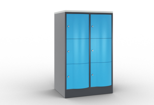 La porte battante convexe vers l’avant est absolument stable et résistante au vandalisme, même aux coups de pied. Les portes battantes sont montées sur des charnières robustes à espagnolettes internes et résistent ainsi à des sollicitations élevées. Chaque porte est équipée de série d’un amortisseur, de sorte que, même fermée avec élan, elle ne claque pas. Cela contribue non seulement à améliorer l’environnement sonore, mais protège aussi l’armoire en acier des dommages. De plus, la limitation d’ouverture de porte protège la porte contre l’extension excessive et contre le chevauchement de la surface utile avec l’armoire annexe. verrouillable avec serrure à cylindre. Les orifices de ventilation dans la paroi arrière assurent une bonne circulation de l’air dans chaque casier. Grâce au plateau supérieur, l’armoire à poser peut être utilisée comme surface de travail ou tablette supplémentaire. Le socle encastré permet de répartir uniformément le poids de l’armoire sur le sol. Cela augmente la stabilité et l’armoire peut supporter des charges plus lourdes qu’une armoire à pieds. De plus, la saleté, la poussière et l’humidité ne peuvent pas s’infiltrer sous l’armoire, ce qui réduit la surface de nettoyage. structure en tôle d'acier, soudé. corps avec thermolaquage. face avant avec thermolaquage. panneau finition comme couleur du corps.
