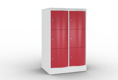 La porte battante convexe vers l’avant est absolument stable et résistante au vandalisme, même aux coups de pied. Les portes battantes sont montées sur des charnières robustes à espagnolettes internes et résistent ainsi à des sollicitations élevées. Chaque porte est équipée de série d’un amortisseur, de sorte que, même fermée avec élan, elle ne claque pas. Cela contribue non seulement à améliorer l’environnement sonore, mais protège aussi l’armoire en acier des dommages. De plus, la limitation d’ouverture de porte protège la porte contre l’extension excessive et contre le chevauchement de la surface utile avec l’armoire annexe. verrouillable avec serrure à cylindre. Les orifices de ventilation dans la paroi arrière assurent une bonne circulation de l’air dans chaque casier. Grâce au plateau supérieur, l’armoire à poser peut être utilisée comme surface de travail ou tablette supplémentaire. Le socle encastré permet de répartir uniformément le poids de l’armoire sur le sol. Cela augmente la stabilité et l’armoire peut supporter des charges plus lourdes qu’une armoire à pieds. De plus, la saleté, la poussière et l’humidité ne peuvent pas s’infiltrer sous l’armoire, ce qui réduit la surface de nettoyage. structure en tôle d'acier, soudé. corps avec thermolaquage. face avant avec thermolaquage. panneau finition comme couleur du corps.