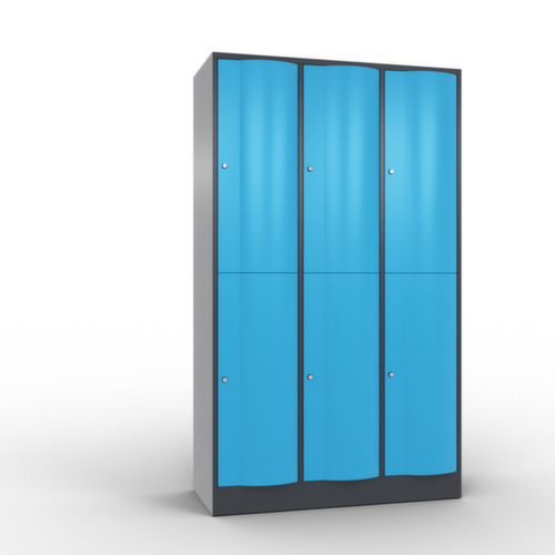 La porte battante convexe vers l’avant est absolument stable et résistante au vandalisme, même aux coups de pied. Les portes battantes sont montées sur des charnières robustes à espagnolettes internes et résistent ainsi à des sollicitations élevées. Chaque porte est équipée de série d’un amortisseur, de sorte que, même fermée avec élan, elle ne claque pas. Cela contribue non seulement à améliorer l’environnement sonore, mais protège aussi l’armoire en acier des dommages. De plus, la limitation d’ouverture de porte protège la porte contre l’extension excessive et contre le chevauchement de la surface utile avec l’armoire annexe. verrouillable avec serrure à cylindre. Les orifices de ventilation dans la paroi arrière assurent une bonne circulation de l’air dans chaque casier. Grâce au plateau supérieur, l’armoire à poser peut être utilisée comme surface de travail ou tablette supplémentaire. Le socle encastré permet de répartir uniformément le poids de l’armoire sur le sol. Cela augmente la stabilité et l’armoire peut supporter des charges plus lourdes qu’une armoire à pieds. De plus, la saleté, la poussière et l’humidité ne peuvent pas s’infiltrer sous l’armoire, ce qui réduit la surface de nettoyage. structure en tôle d'acier, soudé. corps avec thermolaquage. face avant avec thermolaquage.