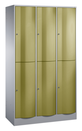 La porte battante convexe vers l’avant est absolument stable et résistante au vandalisme, même aux coups de pied. Les portes battantes sont montées sur des charnières robustes à espagnolettes internes et résistent ainsi à des sollicitations élevées. portes bombées vers l'extérieur avec charnière à espagnolette et amortisseur. Chaque porte est équipée de série d’un amortisseur, de sorte que, même fermée avec élan, elle ne claque pas. Cela contribue non seulement à améliorer l’environnement sonore, mais protège aussi l’armoire en acier des dommages. De plus, la limitation d’ouverture de porte protège la porte contre l’extension excessive et contre le chevauchement de la surface utile avec l’armoire annexe. verrouillable avec serrure à cylindre. Les orifices de ventilation dans la paroi arrière assurent une bonne circulation de l’air dans chaque casier. Le socle encastré permet de répartir uniformément le poids de l’armoire sur le sol. Cela augmente la stabilité et l’armoire peut supporter des charges plus lourdes qu’une armoire à pieds. De plus, la saleté, la poussière et l’humidité ne peuvent pas s’infiltrer sous l’armoire, ce qui réduit la surface de nettoyage. structure en tôle d'acier, soudé. corps avec thermolaquage en argent. face avant avec thermolaquage en jaune pastel.