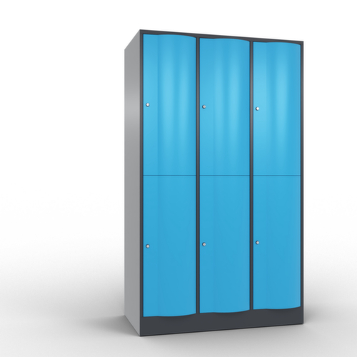 La porte battante convexe vers l’avant est absolument stable et résistante au vandalisme, même aux coups de pied. Les portes battantes sont montées sur des charnières robustes à espagnolettes internes et résistent ainsi à des sollicitations élevées. Chaque porte est équipée de série d’un amortisseur, de sorte que, même fermée avec élan, elle ne claque pas. Cela contribue non seulement à améliorer l’environnement sonore, mais protège aussi l’armoire en acier des dommages. De plus, la limitation d’ouverture de porte protège la porte contre l’extension excessive et contre le chevauchement de la surface utile avec l’armoire annexe. verrouillable avec serrure à cylindre. Les orifices de ventilation dans la paroi arrière assurent une bonne circulation de l’air dans chaque casier. Grâce au plateau supérieur, l’armoire à poser peut être utilisée comme surface de travail ou tablette supplémentaire. Le socle encastré permet de répartir uniformément le poids de l’armoire sur le sol. Cela augmente la stabilité et l’armoire peut supporter des charges plus lourdes qu’une armoire à pieds. De plus, la saleté, la poussière et l’humidité ne peuvent pas s’infiltrer sous l’armoire, ce qui réduit la surface de nettoyage. structure en tôle d'acier, soudé. corps avec thermolaquage. face avant avec thermolaquage.