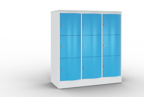 La porte battante convexe vers l’avant est absolument stable et résistante au vandalisme, même aux coups de pied. Les portes battantes sont montées sur des charnières robustes à espagnolettes internes et résistent ainsi à des sollicitations élevées. Chaque porte est équipée de série d’un amortisseur, de sorte que, même fermée avec élan, elle ne claque pas. Cela contribue non seulement à améliorer l’environnement sonore, mais protège aussi l’armoire en acier des dommages. De plus, la limitation d’ouverture de porte protège la porte contre l’extension excessive et contre le chevauchement de la surface utile avec l’armoire annexe. verrouillable avec serrure à cylindre. Les orifices de ventilation dans la paroi arrière assurent une bonne circulation de l’air dans chaque casier. Grâce au plateau supérieur, l’armoire à poser peut être utilisée comme surface de travail ou tablette supplémentaire. Le socle encastré permet de répartir uniformément le poids de l’armoire sur le sol. Cela augmente la stabilité et l’armoire peut supporter des charges plus lourdes qu’une armoire à pieds. De plus, la saleté, la poussière et l’humidité ne peuvent pas s’infiltrer sous l’armoire, ce qui réduit la surface de nettoyage. structure en tôle d'acier, soudé. corps avec thermolaquage. face avant avec thermolaquage. panneau finition comme couleur du corps.