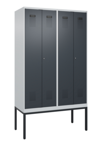 Les principales dimensions de C+P l’armoire vestiaire Evolo PLUS en un coup d’œil :par compartiment une tablette à chapeaux soudée au-dessus d’une tringle avec 3 doubles crochets coulissants anti-torsion. Les double portes battantes peuvent être facilement personnalisées grâce au porte-étiquette pratique. Malgré la perforation décorative design qui est essentielle pour l'aération, l'armoire reste dans l'ensemble lisse, hygiénique et facile à nettoyer. Les gonds intérieurs des portes battantes offrent l’avantage d’un visuel net, car aucune vis ou charnière n’est visible de l’extérieur. Le design de l’armoire n’est donc pas altéré et l’ensemble du meuble semble de meilleure qualité. La surface lisse est également plus facile à nettoyer, car aucun dépôt de saleté ou de poussière n’est à craindre aux endroits inaccessibles. Chaque porte est équipée de série d’un amortisseur, de sorte que, même fermée avec élan, elle ne claque pas. Cela contribue non seulement à améliorer l’environnement sonore, mais protège aussi l’armoire en acier des dommages. La structure BIONIC Steel Frame, inspirée de la nature, est une construction particulièrement efficace et stable. La structure interne raffinée composée de pliages, d’entretoises et d’espaces, ainsi que la plus grande épaisseur de matériau aux endroits cruciaux, comme à l’avant des parois latérales et dans les profilés de cloisons et de caissons, augmentent encore la rigidité. verrouillable avec serrure à cylindre. Chaque personne dispose de 2 compartiments qui peuvent être verrouillés ensemble via des portes convergentes. Cela permet de séparer de manière simple et efficace les vêtements de travail et ceux de tous les jours. Le concept d'auto-aération sophistiqué permet une circulation optimisée de l'air. Des espaces d'aération définis devant et derrière la tablette dans le dessous et dans le dessus du compartiment, en combinaison avec la perforation décorative dans la porte, contribuent à un flux d'air agréable. . L'intérieur de l'armoire est ainsi mieux aéré et son contenu sèche plus vite sans générer de mauvaises odeurs. Le piètement intégré réduit l'accumulation possible de la poussière et de la saleté en facilitant le nettoyage de toute la surface. Crée en plus un espace de rangement supplémentaire sous l'armoire. Les chaussures et les sacs ne sont plus dans le passage, et le risque de trébuchement est minimisé. structure en acier, soudé de manière stable. Cela rend la structure particulièrement robuste et résistante, et donc plus durable. Les coins et les angles soudés du corps garantissent une plus grande étanchéité et donc une meilleure protection contre la poussière, l’humidité et la saleté qu’une structure vissée. En outre, il n’est pas nécessaire de procéder à des travaux d’entretien réguliers ni à des réajustements. corps avec thermolaquage en RAL7035 gris clair, face avant avec thermolaquage en RAL7016 gris anthracite.