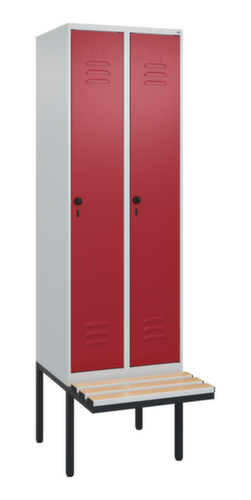Les principales dimensions de C+P l’armoire vestiaire Classic Plus en un coup d’œil :par compartiment tablette pour chapeaux, tringle à vêtements, crochet. Le compartiment sous la tablette à chapeaux est divisé par une cloison de séparation médiane. Cela permet une séparation nette en noir et blanc des vêtements de travail et des vêtements de tous les jours. porte battante avec porte-étiquette et fentes d’aération. Les gonds intérieurs des portes battantes offrent l’avantage d’un visuel net, car aucune vis ou charnière n’est visible de l’extérieur. Le design de l’armoire n’est donc pas altéré et l’ensemble du meuble semble de meilleure qualité. La surface lisse est également plus facile à nettoyer, car aucun dépôt de saleté ou de poussière n’est à craindre aux endroits inaccessibles. Chaque porte est équipée de série d’un amortisseur, de sorte que, même fermée avec élan, elle ne claque pas. Cela contribue non seulement à améliorer l’environnement sonore, mais protège aussi l’armoire en acier des dommages. La structure BIONIC Steel Frame, inspirée de la nature, est une construction particulièrement efficace et stable. La structure interne raffinée composée de pliages, d’entretoises et d’espaces, ainsi que la plus grande épaisseur de matériau aux endroits cruciaux, comme à l’avant des parois latérales et dans les profilés de cloisons et de caissons, augmentent encore la rigidité. Verrouillable avec Porte-cadenas de sécurité pour cadenas. La serrure de sécurité est particulièrement résistante aux effractions puisqu’elle tourne en position verrouillée et se verrouille uniquement après le retrait de la serrure. Convient pour tous les cadenas avec une épaisseur d'anse de 6 - 8 mm. Les orifices de ventilation supplémentaires dans le compartiment, combinés aux fentes d’aération dans la porte, améliorent le flux d’air. L’intérieur de l’armoire est ainsi mieux ventilé et son contenu sèche plus vite, sans générer de mauvaises odeurs. banc à l’avant. Les lames sont en plastique. structure en acier, soudé de manière stable. Cela rend la structure particulièrement robuste et résistante, et donc plus durable. Les coins et les angles soudés du corps garantissent une plus grande étanchéité et donc une meilleure protection contre la poussière, l’humidité et la saleté qu’une structure vissée. En outre, il n’est pas nécessaire de procéder à des travaux d’entretien réguliers ni à des réajustements. corps avec thermolaquage en RAL7035 gris clair, face avant avec thermolaquage en RAL3003 rouge rubis.