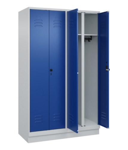 Les principales dimensions de C+P l’armoire vestiaire Classic Plus en un coup d’œil :par compartiment une tablette à chapeaux soudée au-dessus d’une tringle avec 3 doubles crochets coulissants anti-torsion. porte battante avec porte-étiquette et fentes d’aération. Les gonds intérieurs des portes battantes offrent l’avantage d’un visuel net, car aucune vis ou charnière n’est visible de l’extérieur. Le design de l’armoire n’est donc pas altéré et l’ensemble du meuble semble de meilleure qualité. La surface lisse est également plus facile à nettoyer, car aucun dépôt de saleté ou de poussière n’est à craindre aux endroits inaccessibles. Chaque porte est équipée de série d’un amortisseur, de sorte que, même fermée avec élan, elle ne claque pas. Cela contribue non seulement à améliorer l’environnement sonore, mais protège aussi l’armoire en acier des dommages. La structure BIONIC Steel Frame, inspirée de la nature, est une construction particulièrement efficace et stable. La structure interne raffinée composée de pliages, d’entretoises et d’espaces, ainsi que la plus grande épaisseur de matériau aux endroits cruciaux, comme à l’avant des parois latérales et dans les profilés de cloisons et de caissons, augmentent encore la rigidité. Verrouillable avec Porte-cadenas de sécurité pour cadenas. La serrure de sécurité est particulièrement résistante aux effractions puisqu’elle tourne en position verrouillée et se verrouille uniquement après le retrait de la serrure. Convient pour tous les cadenas avec une épaisseur d'anse de 6 - 8 mm. Chaque personne dispose de 2 compartiments qui peuvent être verrouillés ensemble via des portes convergentes. Cela permet de séparer de manière simple et efficace les vêtements de travail et ceux de tous les jours. Les orifices de ventilation supplémentaires dans le compartiment, combinés aux fentes d’aération dans la porte, améliorent le flux d’air. L’intérieur de l’armoire est ainsi mieux ventilé et son contenu sèche plus vite, sans générer de mauvaises odeurs. Le socle encastré permet de répartir uniformément le poids de l’armoire sur le sol. Cela augmente la stabilité et l’armoire peut supporter des charges plus lourdes qu’une armoire à pieds. De plus, la saleté, la poussière et l’humidité ne peuvent pas s’infiltrer sous l’armoire, ce qui réduit la surface de nettoyage. structure en acier, soudé de manière stable. Cela rend la structure particulièrement robuste et résistante, et donc plus durable. Les coins et les angles soudés du corps garantissent une plus grande étanchéité et donc une meilleure protection contre la poussière, l’humidité et la saleté qu’une structure vissée. En outre, il n’est pas nécessaire de procéder à des travaux d’entretien réguliers ni à des réajustements. corps avec thermolaquage en RAL7035 gris clair, face avant avec thermolaquage en RAL5010 bleu gentiane.