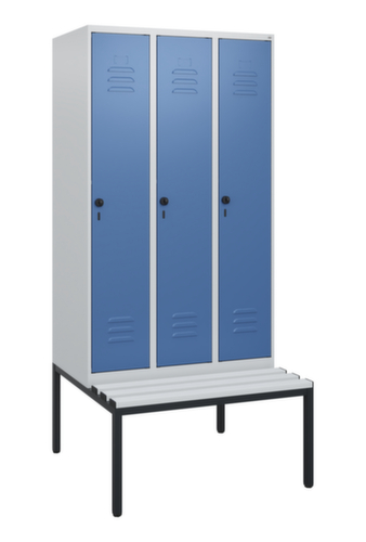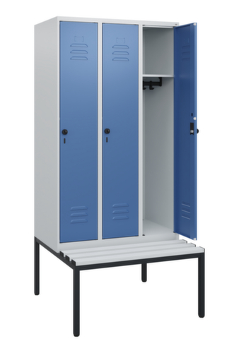 Les principales dimensions de C+P l’armoire vestiaire Classic Plus en un coup d’œil :par compartiment une tablette à chapeaux soudée au-dessus d’une tringle avec 3 doubles crochets coulissants anti-torsion. porte battante avec porte-étiquette et fentes d’aération. Les gonds intérieurs des portes battantes offrent l’avantage d’un visuel net, car aucune vis ou charnière n’est visible de l’extérieur. Le design de l’armoire n’est donc pas altéré et l’ensemble du meuble semble de meilleure qualité. La surface lisse est également plus facile à nettoyer, car aucun dépôt de saleté ou de poussière n’est à craindre aux endroits inaccessibles. Chaque porte est équipée de série d’un amortisseur, de sorte que, même fermée avec élan, elle ne claque pas. Cela contribue non seulement à améliorer l’environnement sonore, mais protège aussi l’armoire en acier des dommages. La structure BIONIC Steel Frame, inspirée de la nature, est une construction particulièrement efficace et stable. La structure interne raffinée composée de pliages, d’entretoises et d’espaces, ainsi que la plus grande épaisseur de matériau aux endroits cruciaux, comme à l’avant des parois latérales et dans les profilés de cloisons et de caissons, augmentent encore la rigidité. Verrouillable avec Porte-cadenas de sécurité pour cadenas. La serrure de sécurité est particulièrement résistante aux effractions puisqu’elle tourne en position verrouillée et se verrouille uniquement après le retrait de la serrure. Convient pour tous les cadenas avec une épaisseur d'anse de 6 - 8 mm. Les orifices de ventilation supplémentaires dans le compartiment, combinés aux fentes d’aération dans la porte, améliorent le flux d’air. L’intérieur de l’armoire est ainsi mieux ventilé et son contenu sèche plus vite, sans générer de mauvaises odeurs. Le banc intégré assure une utilisation efficace de l'espace disponible. Il permet de s'habiller et de se déshabiller facilement et offre un espace de rangement supplémentaire sans prendre de place. Les lames sont en plastique. structure en acier, soudé de manière stable. Cela rend la structure particulièrement robuste et résistante, et donc plus durable. Les coins et les angles soudés du corps garantissent une plus grande étanchéité et donc une meilleure protection contre la poussière, l’humidité et la saleté qu’une structure vissée. En outre, il n’est pas nécessaire de procéder à des travaux d’entretien réguliers ni à des réajustements. corps avec thermolaquage en RAL7035 gris clair, face avant avec thermolaquage en RAL5023 bleu distant.