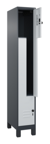 Les principales dimensions de C+P l’armoire vestiaire Classic Plus en un coup d’œil :par compartiment 1 tringle avec 3 doubles crochets coulissants anti-torsion. porte battante avec porte-étiquette et fentes d’aération. Les gonds intérieurs des portes battantes offrent l’avantage d’un visuel net, car aucune vis ou charnière n’est visible de l’extérieur. Le design de l’armoire n’est donc pas altéré et l’ensemble du meuble semble de meilleure qualité. La surface lisse est également plus facile à nettoyer, car aucun dépôt de saleté ou de poussière n’est à craindre aux endroits inaccessibles. Chaque porte est équipée de série d’un amortisseur, de sorte que, même fermée avec élan, elle ne claque pas. Cela contribue non seulement à améliorer l’environnement sonore, mais protège aussi l’armoire en acier des dommages. La structure BIONIC Steel Frame, inspirée de la nature, est une construction particulièrement efficace et stable. La structure interne raffinée composée de pliages, d’entretoises et d’espaces, ainsi que la plus grande épaisseur de matériau aux endroits cruciaux, comme à l’avant des parois latérales et dans les profilés de cloisons et de caissons, augmentent encore la rigidité. Verrouillable avec Porte-cadenas de sécurité pour cadenas. La serrure de sécurité est particulièrement résistante aux effractions puisqu’elle tourne en position verrouillée et se verrouille uniquement après le retrait de la serrure. Convient pour tous les cadenas avec une épaisseur d'anse de 6 - 8 mm. Les orifices de ventilation supplémentaires dans le compartiment, combinés aux fentes d’aération dans la porte, améliorent le flux d’air. L’intérieur de l’armoire est ainsi mieux ventilé et son contenu sèche plus vite, sans générer de mauvaises odeurs. Les pieds encastrés en plastique confèrent non seulement un aspect moderne et léger à l’armoire, qui paraît moins massive, mais offrent également des avantages pratiques. L’espace ouvert au-dessus du sol facilite le nettoyage et le matériau plastique offre une protection accrue contre la corrosion. Cet aspect est particulièrement important dans les environnements où les exigences en matière d’hygiène sont élevées. structure en acier, soudé de manière stable. Cela rend la structure particulièrement robuste et résistante, et donc plus durable. Les coins et les angles soudés du corps garantissent une plus grande étanchéité et donc une meilleure protection contre la poussière, l’humidité et la saleté qu’une structure vissée. En outre, il n’est pas nécessaire de procéder à des travaux d’entretien réguliers ni à des réajustements. corps avec thermolaquage en RAL7016 gris anthracite, face avant avec thermolaquage en RAL7035 gris clair.