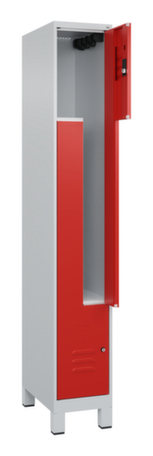 Les principales dimensions de C+P l’armoire vestiaire Classic Plus en un coup d’œil :par compartiment 1 tringle avec 3 doubles crochets coulissants anti-torsion. porte battante avec porte-étiquette et fentes d’aération. Les gonds intérieurs des portes battantes offrent l’avantage d’un visuel net, car aucune vis ou charnière n’est visible de l’extérieur. Le design de l’armoire n’est donc pas altéré et l’ensemble du meuble semble de meilleure qualité. La surface lisse est également plus facile à nettoyer, car aucun dépôt de saleté ou de poussière n’est à craindre aux endroits inaccessibles. Chaque porte est équipée de série d’un amortisseur, de sorte que, même fermée avec élan, elle ne claque pas. Cela contribue non seulement à améliorer l’environnement sonore, mais protège aussi l’armoire en acier des dommages. La structure BIONIC Steel Frame, inspirée de la nature, est une construction particulièrement efficace et stable. La structure interne raffinée composée de pliages, d’entretoises et d’espaces, ainsi que la plus grande épaisseur de matériau aux endroits cruciaux, comme à l’avant des parois latérales et dans les profilés de cloisons et de caissons, augmentent encore la rigidité. verrouillable avec serrure à cylindre. Les orifices de ventilation supplémentaires dans le compartiment, combinés aux fentes d’aération dans la porte, améliorent le flux d’air. L’intérieur de l’armoire est ainsi mieux ventilé et son contenu sèche plus vite, sans générer de mauvaises odeurs. Les pieds encastrés en plastique confèrent non seulement un aspect moderne et léger à l’armoire, qui paraît moins massive, mais offrent également des avantages pratiques. L’espace ouvert au-dessus du sol facilite le nettoyage et le matériau plastique offre une protection accrue contre la corrosion. Cet aspect est particulièrement important dans les environnements où les exigences en matière d’hygiène sont élevées. structure en acier, soudé de manière stable. Cela rend la structure particulièrement robuste et résistante, et donc plus durable. Les coins et les angles soudés du corps garantissent une plus grande étanchéité et donc une meilleure protection contre la poussière, l’humidité et la saleté qu’une structure vissée. En outre, il n’est pas nécessaire de procéder à des travaux d’entretien réguliers ni à des réajustements. corps avec thermolaquage en RAL7035 gris clair, face avant avec thermolaquage en RAL3020 rouge signalisation.