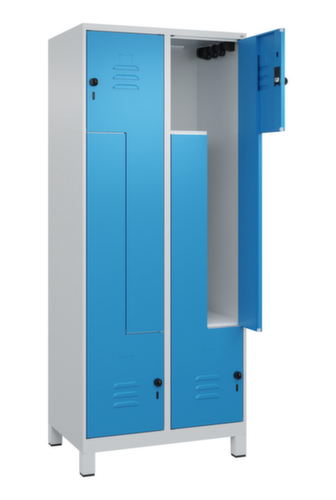 Les principales dimensions de C+P l’armoire vestiaire Classic Plus en un coup d’œil :par compartiment 1 tringle avec 3 doubles crochets coulissants anti-torsion. porte battante avec porte-étiquette et fentes d’aération. Les gonds intérieurs des portes battantes offrent l’avantage d’un visuel net, car aucune vis ou charnière n’est visible de l’extérieur. Le design de l’armoire n’est donc pas altéré et l’ensemble du meuble semble de meilleure qualité. La surface lisse est également plus facile à nettoyer, car aucun dépôt de saleté ou de poussière n’est à craindre aux endroits inaccessibles. Chaque porte est équipée de série d’un amortisseur, de sorte que, même fermée avec élan, elle ne claque pas. Cela contribue non seulement à améliorer l’environnement sonore, mais protège aussi l’armoire en acier des dommages. La structure BIONIC Steel Frame, inspirée de la nature, est une construction particulièrement efficace et stable. La structure interne raffinée composée de pliages, d’entretoises et d’espaces, ainsi que la plus grande épaisseur de matériau aux endroits cruciaux, comme à l’avant des parois latérales et dans les profilés de cloisons et de caissons, augmentent encore la rigidité. Verrouillable avec Porte-cadenas de sécurité pour cadenas. La serrure de sécurité est particulièrement résistante aux effractions puisqu’elle tourne en position verrouillée et se verrouille uniquement après le retrait de la serrure. Convient pour tous les cadenas avec une épaisseur d'anse de 6 - 8 mm. Les orifices de ventilation supplémentaires dans le compartiment, combinés aux fentes d’aération dans la porte, améliorent le flux d’air. L’intérieur de l’armoire est ainsi mieux ventilé et son contenu sèche plus vite, sans générer de mauvaises odeurs. Les pieds encastrés en plastique confèrent non seulement un aspect moderne et léger à l’armoire, qui paraît moins massive, mais offrent également des avantages pratiques. L’espace ouvert au-dessus du sol facilite le nettoyage et le matériau plastique offre une protection accrue contre la corrosion. Cet aspect est particulièrement important dans les environnements où les exigences en matière d’hygiène sont élevées. structure en acier, soudé de manière stable. Cela rend la structure particulièrement robuste et résistante, et donc plus durable. Les coins et les angles soudés du corps garantissent une plus grande étanchéité et donc une meilleure protection contre la poussière, l’humidité et la saleté qu’une structure vissée. En outre, il n’est pas nécessaire de procéder à des travaux d’entretien réguliers ni à des réajustements. corps avec thermolaquage en RAL7035 gris clair, face avant avec thermolaquage en RAL 5012 bleu clair.