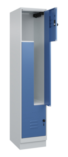 Les principales dimensions de C+P l’armoire vestiaire Classic Plus en un coup d’œil :par compartiment 1 tringle avec 3 doubles crochets coulissants anti-torsion. porte battante avec porte-étiquette et fentes d’aération. Les gonds intérieurs des portes battantes offrent l’avantage d’un visuel net, car aucune vis ou charnière n’est visible de l’extérieur. Le design de l’armoire n’est donc pas altéré et l’ensemble du meuble semble de meilleure qualité. La surface lisse est également plus facile à nettoyer, car aucun dépôt de saleté ou de poussière n’est à craindre aux endroits inaccessibles. Chaque porte est équipée de série d’un amortisseur, de sorte que, même fermée avec élan, elle ne claque pas. Cela contribue non seulement à améliorer l’environnement sonore, mais protège aussi l’armoire en acier des dommages. La structure BIONIC Steel Frame, inspirée de la nature, est une construction particulièrement efficace et stable. La structure interne raffinée composée de pliages, d’entretoises et d’espaces, ainsi que la plus grande épaisseur de matériau aux endroits cruciaux, comme à l’avant des parois latérales et dans les profilés de cloisons et de caissons, augmentent encore la rigidité. Verrouillable avec Porte-cadenas de sécurité pour cadenas. La serrure de sécurité est particulièrement résistante aux effractions puisqu’elle tourne en position verrouillée et se verrouille uniquement après le retrait de la serrure. Convient pour tous les cadenas avec une épaisseur d'anse de 6 - 8 mm. Les orifices de ventilation supplémentaires dans le compartiment, combinés aux fentes d’aération dans la porte, améliorent le flux d’air. L’intérieur de l’armoire est ainsi mieux ventilé et son contenu sèche plus vite, sans générer de mauvaises odeurs. Le socle encastré permet de répartir uniformément le poids de l’armoire sur le sol. Cela augmente la stabilité et l’armoire peut supporter des charges plus lourdes qu’une armoire à pieds. De plus, la saleté, la poussière et l’humidité ne peuvent pas s’infiltrer sous l’armoire, ce qui réduit la surface de nettoyage. structure en acier, soudé de manière stable. Cela rend la structure particulièrement robuste et résistante, et donc plus durable. Les coins et les angles soudés du corps garantissent une plus grande étanchéité et donc une meilleure protection contre la poussière, l’humidité et la saleté qu’une structure vissée. En outre, il n’est pas nécessaire de procéder à des travaux d’entretien réguliers ni à des réajustements. corps avec thermolaquage en RAL7035 gris clair, face avant avec thermolaquage en RAL5023 bleu distant.