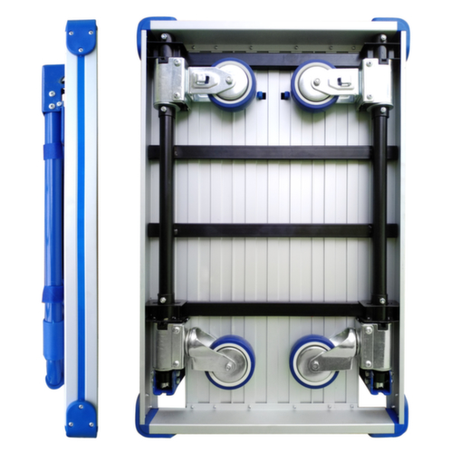 "description": "rabattable, force 200kg, plateau Lxl 705x440mm, panneau alu, rabattable, 2roulettes piv./2fixes, bandage TPE",
