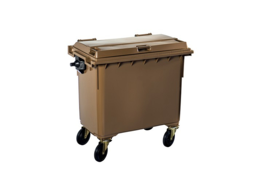 "longDescription": "Poubelle à 4 roues en polyéthylène haute densité 660L brun, uniquement en matériau neuf, résistant aux UV, au froid, à la chaleur et aux produits chimiques, larges poignées sur le couvercle, roulettes lisses avec bandage en caoutchouc plein, axe de roue plein en acier, galvanisé, pédale en accessoire - uniquement pour 120L, selon la norme : DIN30740/EN840, anneau pour porte-sac - uniquement pour 120L<br>",