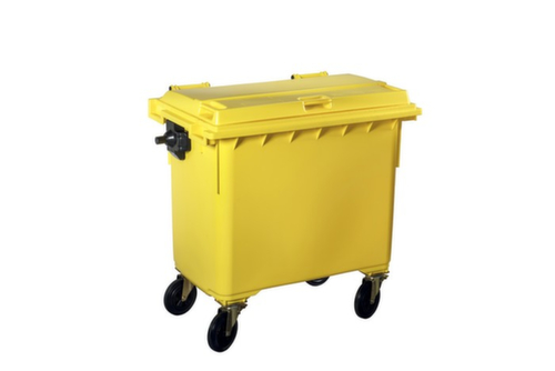 "longDescription": "Poubelle à 4 roues en polyéthylène haute densité 770L jaune, uniquement en matériau neuf, résistant aux UV, au froid, à la chaleur et aux produits chimiques, larges poignées sur le couvercle, roues à roulement doux avec pneus en caoutchouc solide, axe de roue solide en acier, galvanisé, pédale en accessoire - uniquement pour 120L, selon la norme : DIN30740/EN840, anneau pour porte-sac - uniquement pour 120L<br>",
