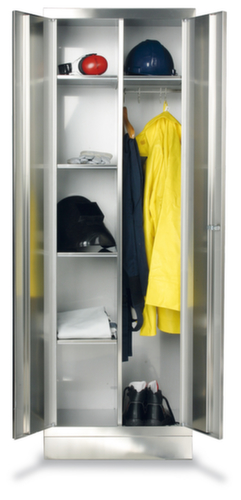 "longDescription": "<h2>Armoire</h2><ul><li>Construction solide et soudée en acier inoxydable</li><li>Portes à impact, renforcées à l'intérieur par un profilé en caisson</li><li>Poignée tournante avec serrure cylindrique de sécurité, 2 clés incluses.</li><li>Étagères solidement soudées, charge maximale 20 kg/étagère</li><li>Au choix, avec 2 étagères à chapeau, 2 tringles à vêtements et 6 crochets ou 5 compartiments, 1 étagère à chapeau, 1 tringle à vêtements et 3 crochets.</li></ul>",