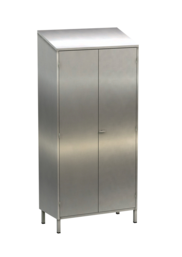 les principales dimensions de l’ armoire universelle en un coup d’œil :Fabriqué en acier inoxydable. La coiffe inclinée empêche le dépôt involontaire d’objets sur l’armoire. La porte à double battant facilite particulièrement l’accès au contenu de l’armoire. Les portes à recouvrement offrent l’avantage de ne pas perdre de place dans l’armoire, car elles ne prennent pas de place à l’intérieur de l’armoire. verrouillable avec serrure porte-cadenas. verrouillage commun des portes. Pour compenser les inégalités du sol, le piètement est équipé de patins en plastique réglables.