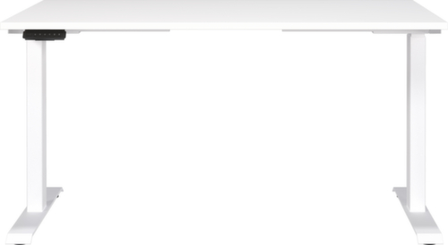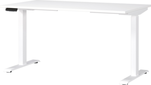 panneau en aggloméré avec revêtement en résine mélaminée antirayures et facile d'entretien finition blanc. bord Une bande de chant ABS résistant aux chocs protège tous les bords de fissures et d'éclatements inesthétiques. piètement en T en métal avec finition époxy résistante aux chocs et aux rayures en blanc. châssis avec Le piètement s’adapte facilement aux irrégularités du sol grâce aux patins de nivellement intégrés, de sorte que la table est toujours droite, même posée p. ex. sur des bords de tapis.