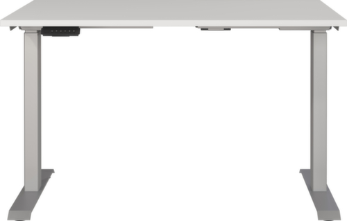 panneau en aggloméré avec revêtement en résine mélaminée antirayures et facile d'entretien finition gris clair. forme de panneau angulaire. bord avec bande de chant ABS résistante aux chocs qui offre une protection contre les fissures et les éclatements disgracieux. double piètement en T en métal avec finition époxy résistante aux chocs et aux rayures en argent. réglage en hauteur via moteur électrique. fonctions : Mémorisation et rappel automatique des hauteurs de table programmées grâce à la fonction mémoire. châssis avec patins en plastique de mise à niveau, parfaits pour compenser les inégalités du sol. Avec câble d'alimentation, fiche et unité de commande électrifiable.