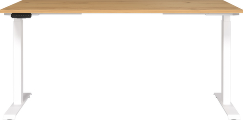 panneau en aggloméré avec revêtement en résine mélaminée antirayures et facile d'entretien finition chêne Navarra. bord avec bande de chant ABS résistante aux chocs qui offre une protection contre les fissures et les éclatements disgracieux. double piètement en T en métal avec finition époxy résistante aux chocs et aux rayures en blanc. châssis avec patins en plastique de mise à niveau, parfaits pour compenser les inégalités du sol. Avec câble d'alimentation, fiche et unité de commande électrifiable.