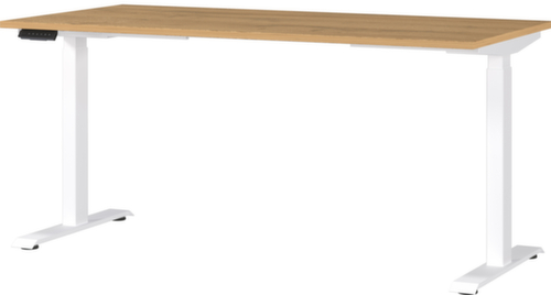 panneau en aggloméré avec revêtement en résine mélaminée antirayures et facile d'entretien finition chêne Grandson. bord avec bande de chant ABS résistante aux chocs qui offre une protection contre les fissures et les éclatements disgracieux. double piètement en T en métal avec finition époxy résistante aux chocs et aux rayures en blanc. châssis avec patins en plastique de mise à niveau, parfaits pour compenser les inégalités du sol. Avec câble d'alimentation, fiche et unité de commande électrifiable.