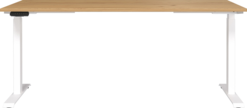 panneau en aggloméré avec revêtement mélaminé, facile d’entretien finition chêne Navarra. bord avec bande de chant ABS résistante aux chocs qui offre une protection contre les fissures et les éclatements disgracieux. double piètement en T en métal avec finition époxy résistante aux chocs et aux rayures en blanc. châssis avec patins en plastique de mise à niveau, parfaits pour compenser les inégalités du sol. Avec câble d'alimentation, fiche et unité de commande électrifiable.