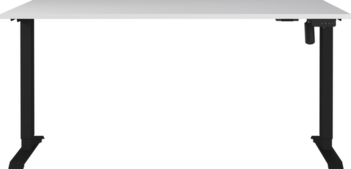 panneau en aggloméré avec revêtement mélaminé, facile d’entretien finition gris clair. bord avec bande de chant ABS résistante aux chocs qui offre une protection contre les fissures et les éclatements disgracieux. piètement en T en métal avec finition époxy résistante aux chocs et aux rayures en noir. réglage en hauteur via moteur électrique. châssis avec patins en plastique de mise à niveau, parfaits pour compenser les inégalités du sol.