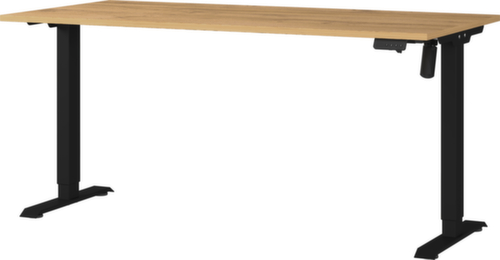 panneau en aggloméré avec revêtement mélaminé, facile d’entretien finition chêne Grandson. bord avec bande de chant ABS résistante aux chocs qui offre une protection contre les fissures et les éclatements disgracieux. piètement en T en métal avec finition époxy résistante aux chocs et aux rayures en noir. réglage en hauteur via moteur électrique. châssis avec patins en plastique de mise à niveau, parfaits pour compenser les inégalités du sol.