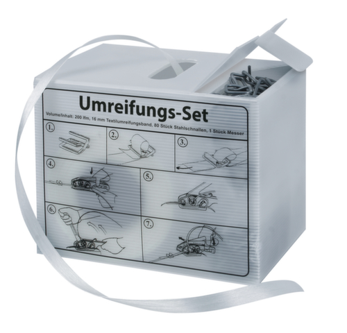 "description": "feuillard PE, agrafes, cutter, bande Lxl 200mx16mm",