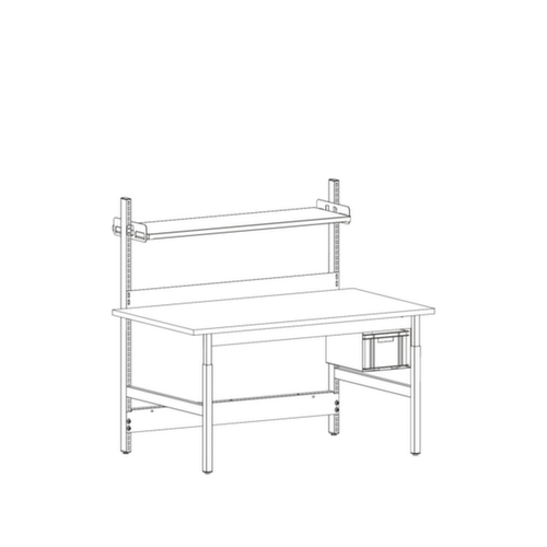panneau en aggloméré avec revêtement mélaminé, facile d’entretien finition RAL7035 gris clair. Une bande de chant ABS résistant aux chocs protège tous les bords de fissures et d'éclatements inesthétiques. piètement 4 pieds avec finition époxy résistante aux chocs et aux rayures en RAL9006 aluminium blanc. hauteur réglable manuellement. Réglage facile par vis de serrage. Réglable au pas de 50 mm.