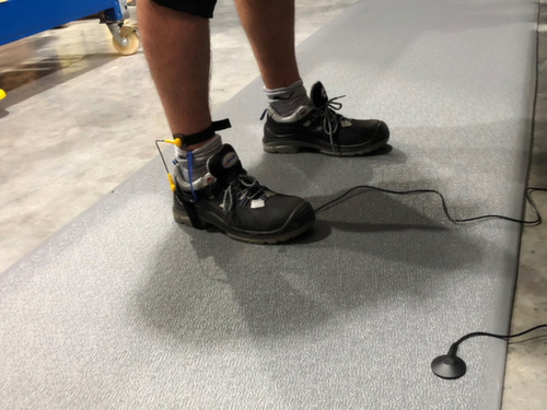 Convient pour zones de travail ESD / pour sollicitations faibles / postes de travail debout avec peu de mouvements en intérieur. tapis. ESD- exécution électroconductrice, résistance de fuite 108 - 10? ohms. 1 couche. kit comprenant : élément de tapis, 2 boutons montés de diamètre 10 mm et 1 câble de terre.
