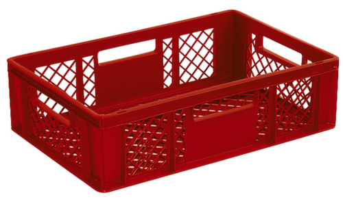 dimensions adaptées aux palettes européennes. en polypropylène incassable en rouge. Parois ajourés, fond ajourés. Fond avec renfort grâce à des rainures de renfort. transport facile grâce à poignées coquilles. Plusieurs niveaux gerbable. convient pour aliments. Adapté aux convoyeurs à rouleaux. Résistant à la température -20 °C à +80 °C. Convient pour différents tissus, nous consulter. recyclable.