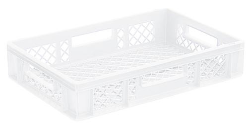 dimensions adaptées aux palettes européennes. en polypropylène incassable en blanc. Parois ajourés, fond ajourés. Fond avec renfort grâce à des rainures de renfort. transport facile grâce à poignées coquilles. Plusieurs niveaux gerbable. convient pour aliments. Adapté aux convoyeurs à rouleaux. Résistant à la température -20 °C à +80 °C. Convient pour différents tissus, nous consulter.