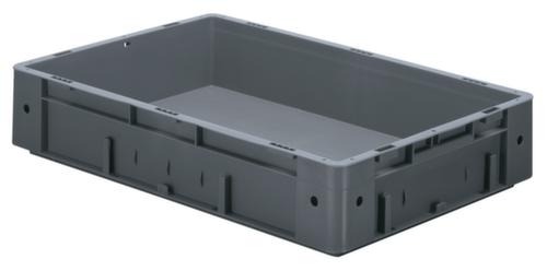 dimensions adaptées aux palettes européennes. en polypropylène incassable en gris. Parois plein sans ouverture de prise, fond plein. Fond avec renfort grâce à des rainures de renfort. transport facile grâce à poignées. avec porte-étiquettes sur tous les côtés. Plusieurs niveaux gerbable. convient pour aliments. Adapté aux convoyeurs à rouleaux. Convient pour différents tissus, nous consulter.