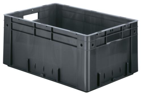 dimensions adaptées aux palettes européennes. en polypropylène incassable en gris. Parois plein sans ouverture de prise, fond plein. Fond avec renfort grâce à des rainures de renfort. transport facile grâce à poignées. avec porte-étiquettes sur tous les côtés. Plusieurs niveaux gerbable. convient pour aliments. Adapté aux convoyeurs à rouleaux. Convient pour différents tissus, nous consulter.