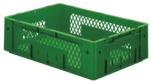 dimensions adaptées aux palettes européennes. en polypropylène incassable en vert. Parois ajourés sans ouverture de prise, fond plein. Fond avec renfort grâce à des rainures de renfort. transport facile grâce à poignées. avec porte-étiquettes sur tous les côtés. Plusieurs niveaux gerbable. convient pour aliments. Adapté aux convoyeurs à rouleaux. Convient pour différents tissus, nous consulter.