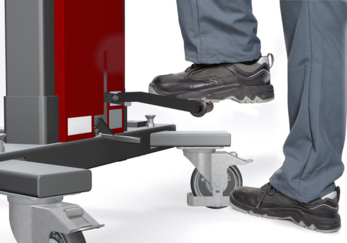 "description": "force 300kg, système de préhension a. mors prismatiques, châssis roulant large, roul. piv. PU, H levage 0-930mm, acier, rouge, commande de levage manuellement par pédale",