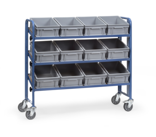 plateau(x) en bois. plateau(x) avec cadre en acier, inclinable. 12 bacs. châssis avec finition époxy résistante aux chocs et aux rayures en RAL5007 bleu brillant. structure en acier. Manœuvre et déplacement aisés grâce à 4 roulettes pivotantes, Les freins situés sur deux roulettes pivotantes offrent la stabilité souhaitée à tout moment. Ø de roue 125 mm. roues avec bandage TPE préservant le sol. moyeu avec roulement rainuré à billes flexible et nécessitant peu d'entretien. disposition des roues rectangulaire. Produit livré démonté.