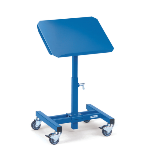 plateforme en acier, avec rebord antichute. structure en acier, soudé. châssis avec finition époxy résistante aux chocs et aux rayures en RAL5007 bleu brillant. hauteur 755 - 1105 mm. niveaux réglables au pas de 25 mm. Manœuvre et déplacement aisés grâce à 4 roulettes pivotantes, Les freins situés sur deux roulettes pivotantes offrent la stabilité souhaitée à tout moment. Ø de roue 75 mm. avec bandage TPE préservant le sol. moyeu avec palier lisse insensible aux chocs et résistant à la corrosion. disposition des roues rectangulaire.