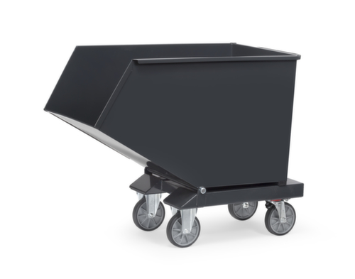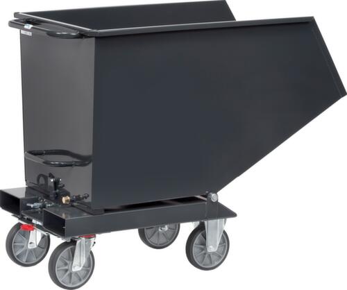 Le procédé de basculement est facile à déclencher manuellement à l'aide d'une poignée située au dos. La protection antibasculement garantit que la benne ne se renverse pas accidentellement pendant le transport. Le récipient est soudé étanche à l’huile. Stabilité élevée grâce aux bords renforcés sur tout le pourtour. Structure robuste en acier avec finition époxy résistante aux chocs et aux rayures coloris RAL7016 gris anthracite. Les roulettes et les fourreaux de fourche facilitent le transport et la prise en charge par un chariot pour le vidage au-dessus d'un conteneur. Grâce aux 2 roulettes pivotantes et 2 roulettes fixes et poignée, la benne roulante se déplace facilement vers le lieu d'utilisation souhaité. Le bandage caoutchouc plein assure en outre un fonctionnement silencieux et amortissant les vibrations. moyeu avec roulement à billes. Les freins situés sur les roulettes pivotantes garantissent une bonne stabilité.
