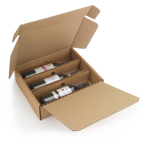 "longDescription": "<h2>Carton à bouteilles avec film de fixation 3 bouteilles</h2><p>L'emballage pratique pour bouteilles vous permet d'expédier 1, 2 ou 3 bouteilles de manière sûre et attrayante. Un carton à 2 cannelures et des rabats latéraux protègent vos bouteilles contre les chocs, tandis qu'un film PE de 60 µ maintient chaque bouteille en place. Pour emballer en toute sécurité, il suffit de placer la bouteille sous le film, de plier les petits côtés de la doublure pour tendre le film et de placer la doublure en carton remplie dans le carton extérieur. L'emballage avec insert en carton et film de fixation convient à des bouteilles de formes différentes d'une hauteur maximale de 33 cm et d'un diamètre maximal de 7,5 cm et peut donc être utilisé pour l'envoi de toutes les bouteilles de 0,75 litre. Vous trouverez également dans notre assortiment d'autres cartons d'expédition pour bouteilles, selon vos besoins!Tous les détails en un coup d'œil : - Matériau du suremballage : carton à 2 cannelures - revêtement extérieur en papier kraft - livraison à plat et séparée de l'insert en carton et du suremballage en carton</p><br>",