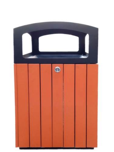 "longDescription": "Poubelle 70L, angulaire, acier traité par électrophorèse, revêtement par poudre noir, caisson en lattes de polystyrène, poubelle intérieure galvanisée avec poignées latérales, verrouillable avec une clé à trois crans, fixation au sol en 4 points, vis incluses, fond perforé pour l'écoulement des eaux de pluie.<br>",