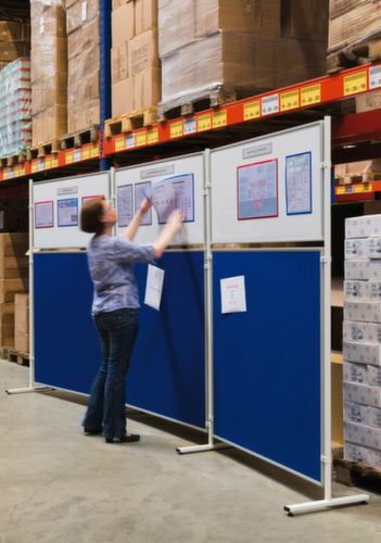 "longDescription": "<h2>Système de cloisons de séparation</h2><strong>Tableau de présentation et séparateur de pièce en un</strong><br><ul><li>Le système modulaire permet l'individualité et l'expansion sans fin.</li><li>Design moderne - cadre en aluminium anodisé argenté avec coins en plastique gris.</li><li>Résistant aux chocs et aux rayures - colonne de support en acier avec revêtement en poudre</li><li>Montage simple : raccordez la carte à la colonne de support à l'aide du kit de montage fourni.</li></ul><br><h3>Vous avez le choix :</h3><ul><li>Surface d'écriture en blanc, effaçable à sec, magnétique</li><li>Surface feutrée en bleu ou gris, épinglable</li><li>Surface liège, pinable</li></ul><br>Ce système de cloisons mobiles de la marque Franken vous offre de multiples combinaisons et possibilités d'utilisation. Les éléments du tableau sont éventuellement dotés sur les deux faces d'une surface d'écriture, d'un revêtement en feutre ou en liège. Avec cette cloison, vous disposez d'un nombre illimité d'options de placement et vous pouvez l'installer dans presque tous les angles, afin qu'elle s'intègre parfaitement à votre pièce. De plus, il peut être étendu à tout moment par un simple assemblage de pinces et de vis et s'adapte ainsi à vos besoins. Le système peut être utilisé comme une séparation de pièce ainsi que comme un mur d'information ou de présentation.<br><br>La surface d'écriture est effaçable à sec et magnétique. La surface en liège et la surface en feutre peuvent toutes deux être épinglées. Le cadre du tableau est en aluminium anodisé argenté avec des coins en plastique. Les colonnes sont fabriquées en acier tubulaire avec des pieds. Sa construction robuste lui permet également d'être utilisé à long terme dans les zones de production ou de stockage. Utilisé correctement sur les stands de foire ou d'exposition, dans la zone de réception ou lors d'événements, vos informations sont toujours parfaitement placées et présentées.<br><br><strong>Bon à savoir !</strong><br>Notez que les colonnes pour le système de cloisons doivent être commandées individuellement et séparément. Si vous devez déplacer régulièrement les cloisons démontables, commandez directement un jeu de roulettes avec freins pour chaque colonne.<br>",